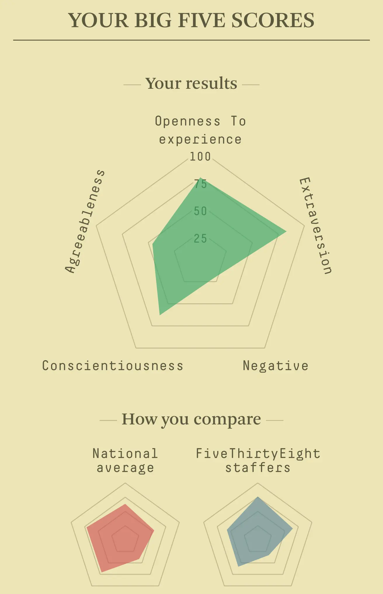 A couple of days ago, I took the “Big 5” personality test on FiveThirtyEight, and I got these results: