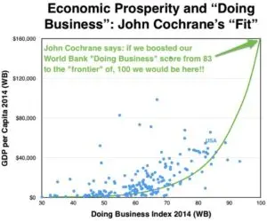 This plots the world bank “Ease of Doing Business” (EDB) score against GDP per Capita. He uses this to make the ridiculous log-linear extrapolation that increasing the United States’ EDB score would significantly increase its GDP per capita.