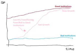 The institutions mostly decide the steady state of the economy, that is the level of wealth you will end up at. While a rich country’s economic growth is mainly limited by technological progress, a poor country transitioning to become a rich country can experience fast growth “on the way up”. This is best pictured by one of my famous shitty MS Paint graphs: