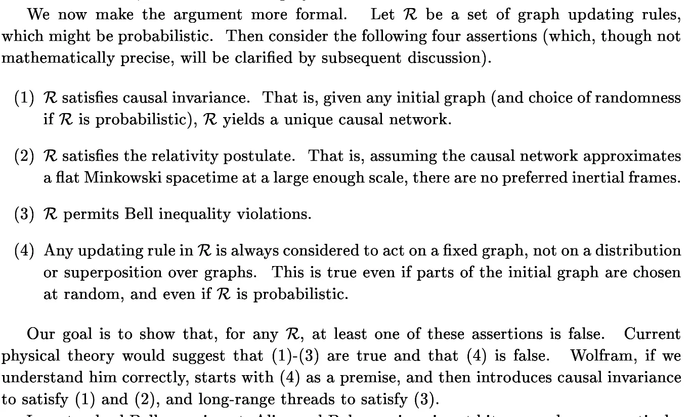 The kind of graphs Wolfram is studying being capable of exhibiting this physical behavior isn’t new to physicists in the domain(1, 2 and this was noted by ANKS reviewers. More importantly, Scott Aaronson’s review (section 3.2) proved this important negative result on the kind of model Wolfram is still studying: