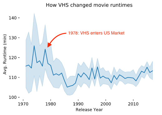 When I saw the sharp drop in runtimes (and narrowing of range of runtimes), I searched and found it began on the exact year VHS were released in America.