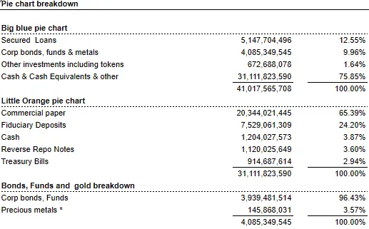Almost all of the reserves are in some form of loan to a commercial company (corporate bonds, commercial paper, secured loans). Only around 5% are in assets whose value we know (cash, T-Bills).