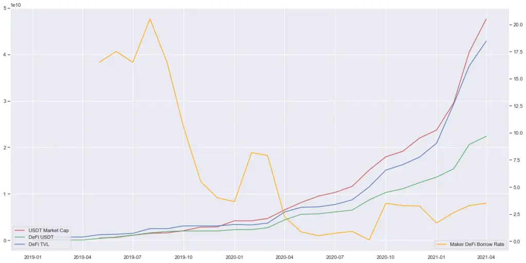 DeFi and stablecoin demand were effectively bootstraped by tether suddenly sending billions to DeFi entities in March/April 2020 (the “other” categories in last section’s issuance plot). This dropped DeFi interest rates and made DeFi borrowing a realistic idea. DeFi then exploded in popularity: