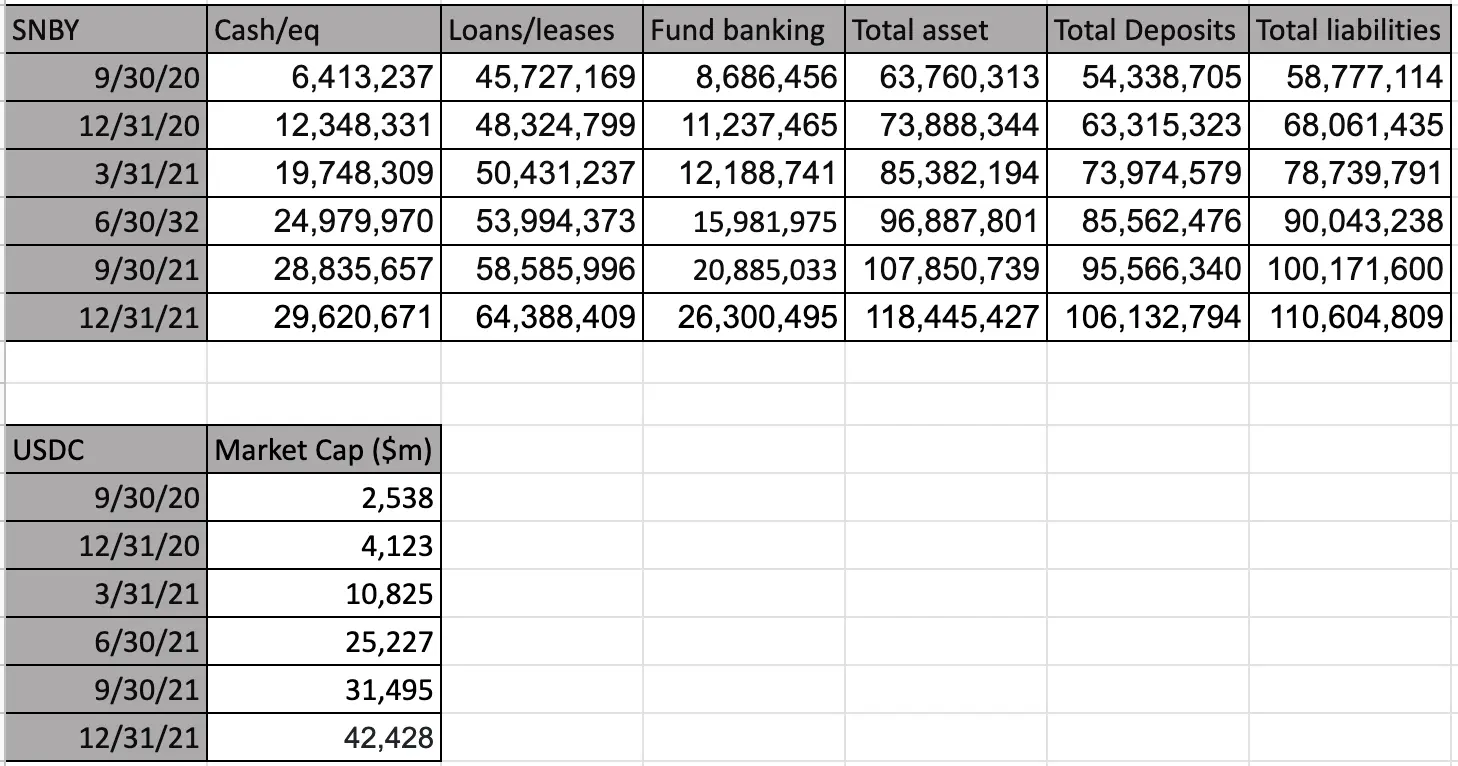 Because SI and SBNY are public companies, we can track their balance sheets every quarter in their respective SEC filings (SI, SBNY). $50B is a lot of money, even for a bank, so we can track the balance sheet changes created by USDC growth. Correlating USDC to the balance sheets, we see that USDC has largely banked at SBNY during their 2021 growth: