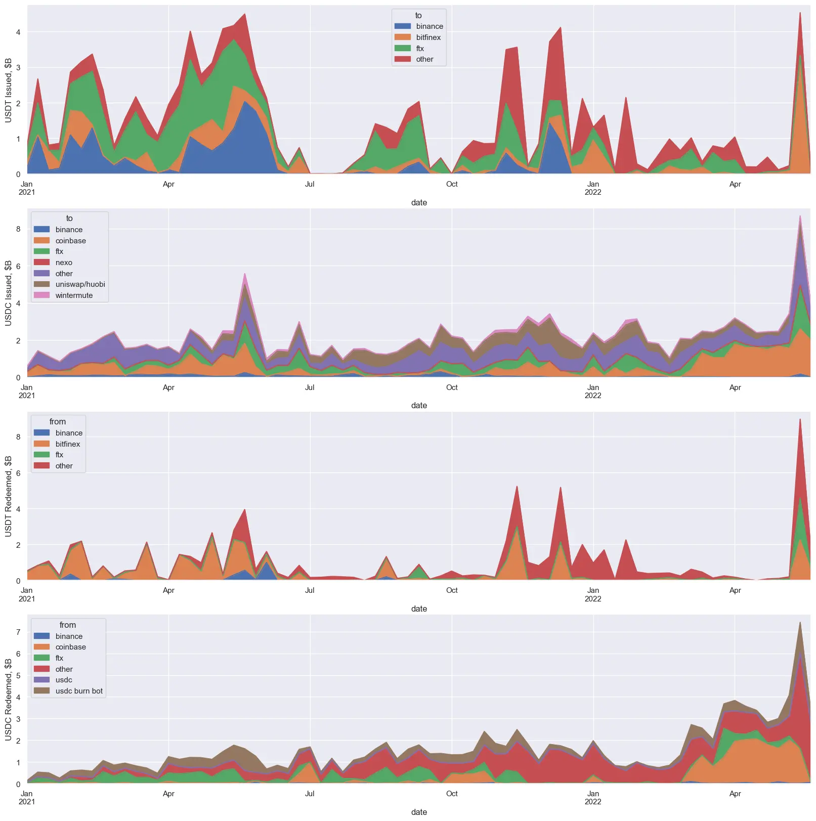 We know that USDC has the money. We also know that almost half of USDT was minted by two algorithmic trading firms, Alameda Research and Cumberland Global. Alameda specifically also minted a lot of USDC, as we can see here: