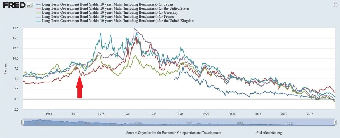 Now, remember that the interest rate has steadily decreased since the dollar has become floating: