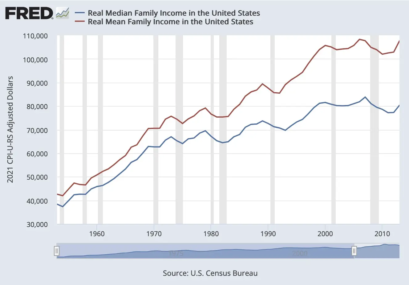 Notice that the EPI chart is plotting median compensation. As we saw in the post on the effect of automation on the labor market, wage inequality has been increasing. This means the gap between the average wage and the median wage has been widening: