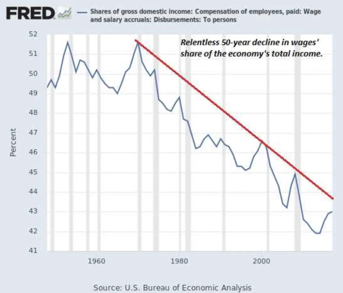 The “relentless 50 year decline in wages” should be labelled the “relentless 50 year increase in healthcare costs”.