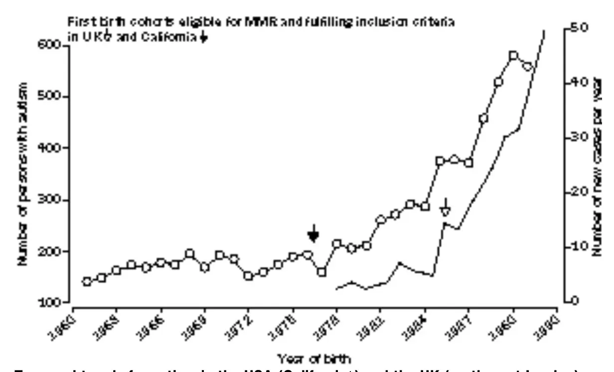 A classic in the “numbers go up so they’re causing each other” field of study is Andrew Wakefield’s 1999 article that claims the MMR vaccine causes autism. Here’s the key chart in the article: