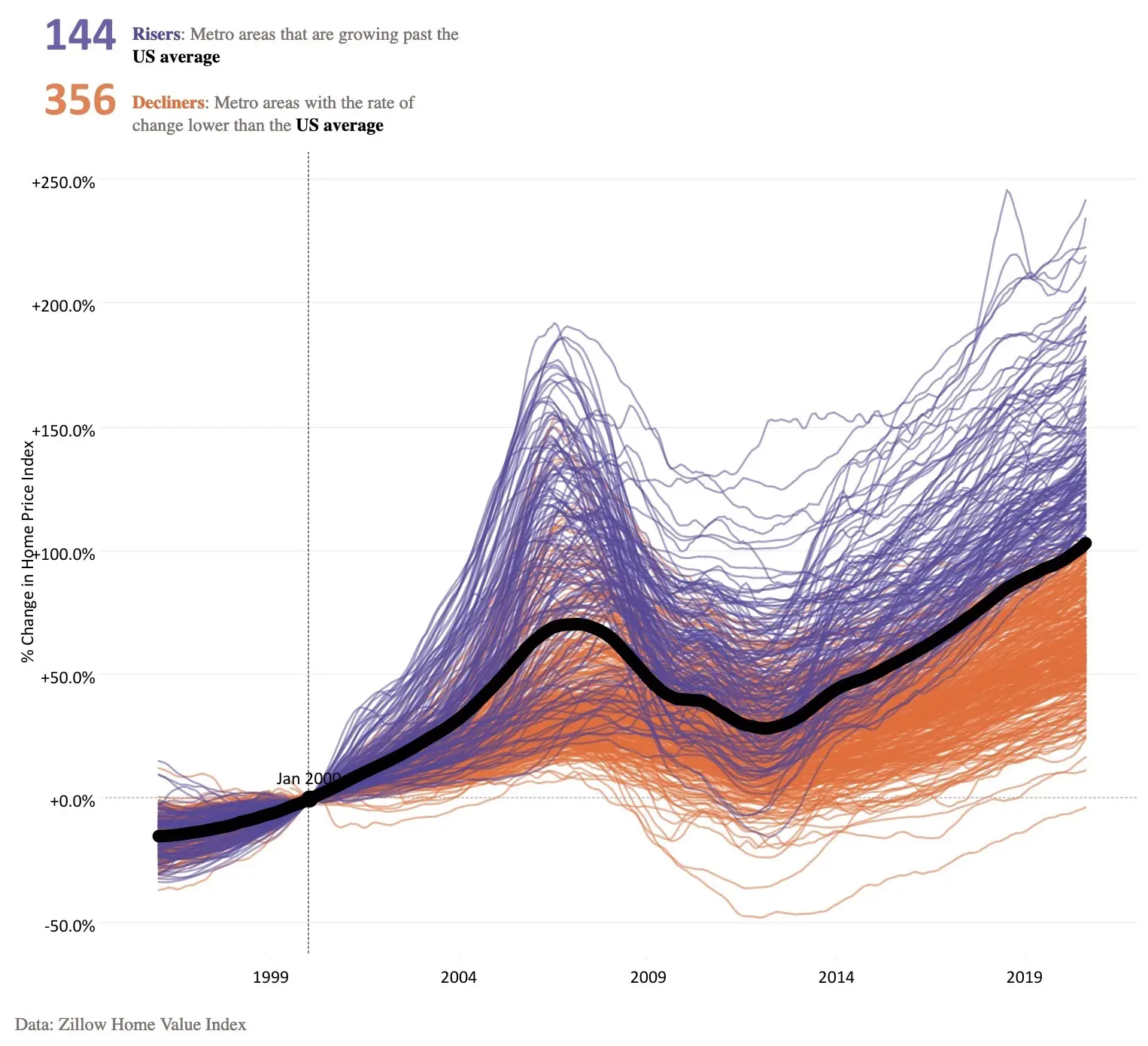 This means there’s a lot more pressure in the housing markets of some particular metro areas. People live in cities. No one is complaining about housing prices in places people are not moving to. Housing price growth is not evenly distributed: