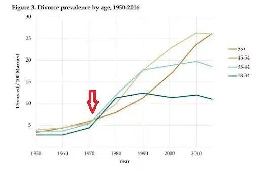 The divorce rate increase since 1960 is related to the no-fault divorce laws passing in the US Before that, if a couple went to a court and said “we hate each other, grant us a divorce, please” the judge could legally say “fuck you, you’re still married, work it out” [footnote]One thing wtfh1971 forgot to note is that domestic violence rates have been dropping since we let couples that hate each other divorce, too[/footnote].